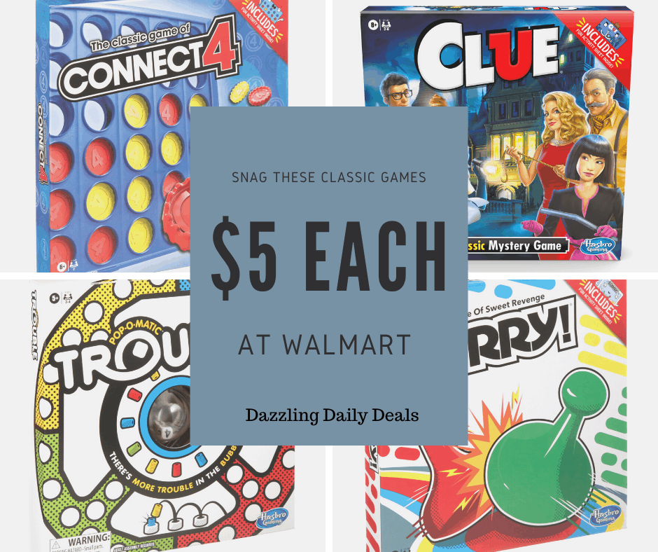 Classic Hasbro Games Only $5 at Walmart! Nov. 11, 2020 This post may earn affiliate income from links and/or review products to help support this site from the companies . Get these classic games for only $5 each at Walmart (affiliated links 🥰) Connect 4 Clue Trouble Sorry