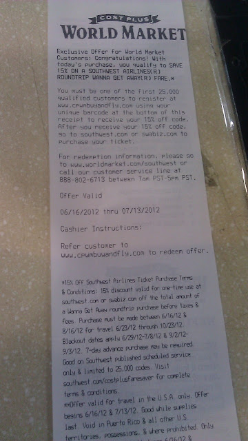 Here is my receipt for the 15% off coupon for Southwest Airlines to purchase a flight