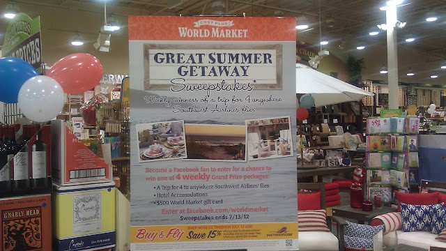 • The Summer Getaway Sweepstakes. Each week during the sweepstakes World Market is giving away a trip for 4 anywhere Southwest Flies, including hotel accommodations and a $500 World Market gift card.Head on over to their facebook page to learn more and how to enter.