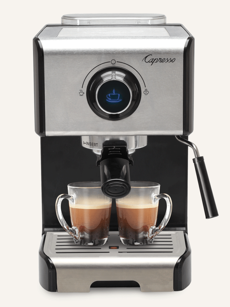 • Heavy-duty portafilter includes two sieves to produce one or two espressos at a time
