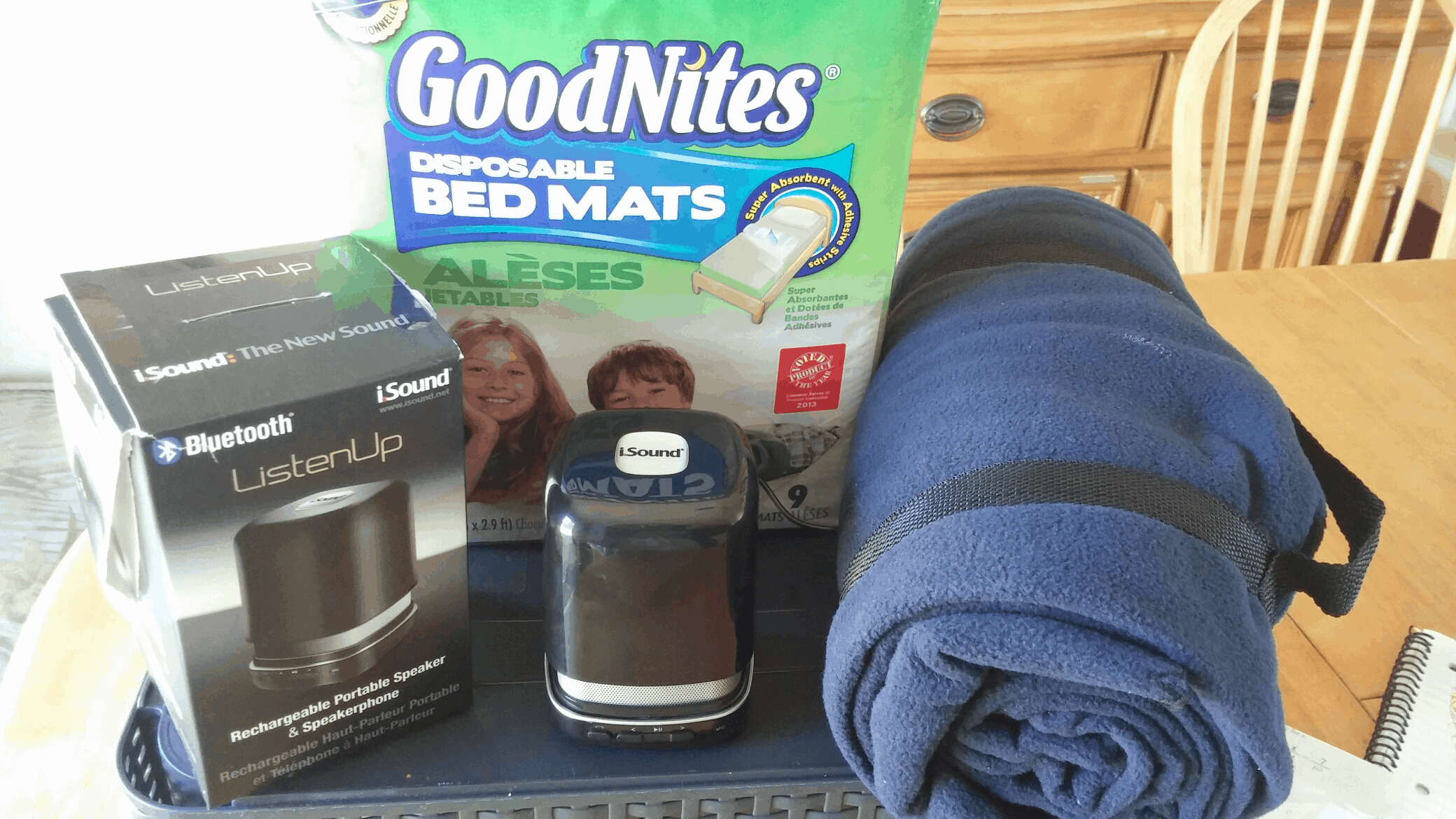 (Our gift set for a better and drier night sleep- GoodNites® Bed Mats, a blankie, and soothing sounds)